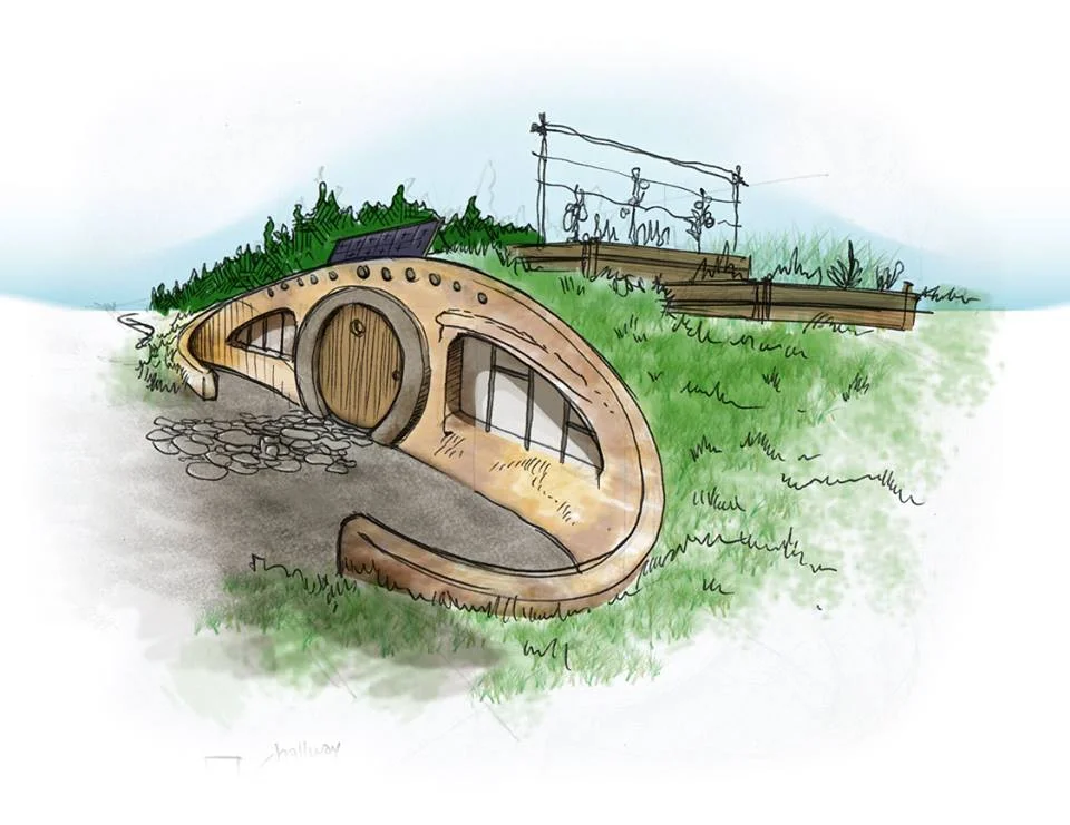 Conceptual drawing for an open source Living Building Challenge house, which will hopefully be 3D printed using earthen materials that sequester carbon and turn the building envelope into limestone